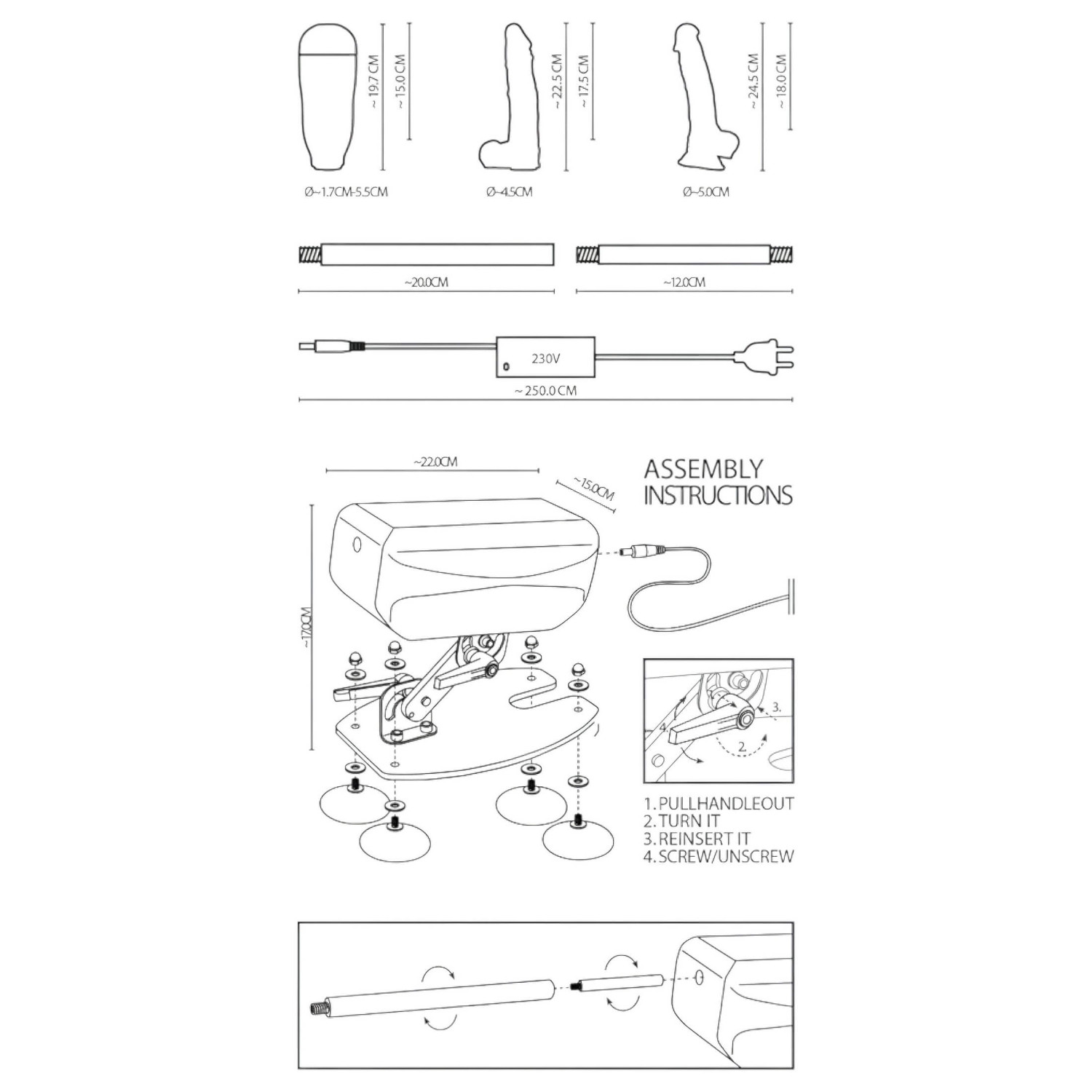 • Monteer de machine volgens de bijgevoegde geïllustreerde instructies & draai een van de dildo’s of de masturbator (met de schroefbare basis) stevig op de stang.