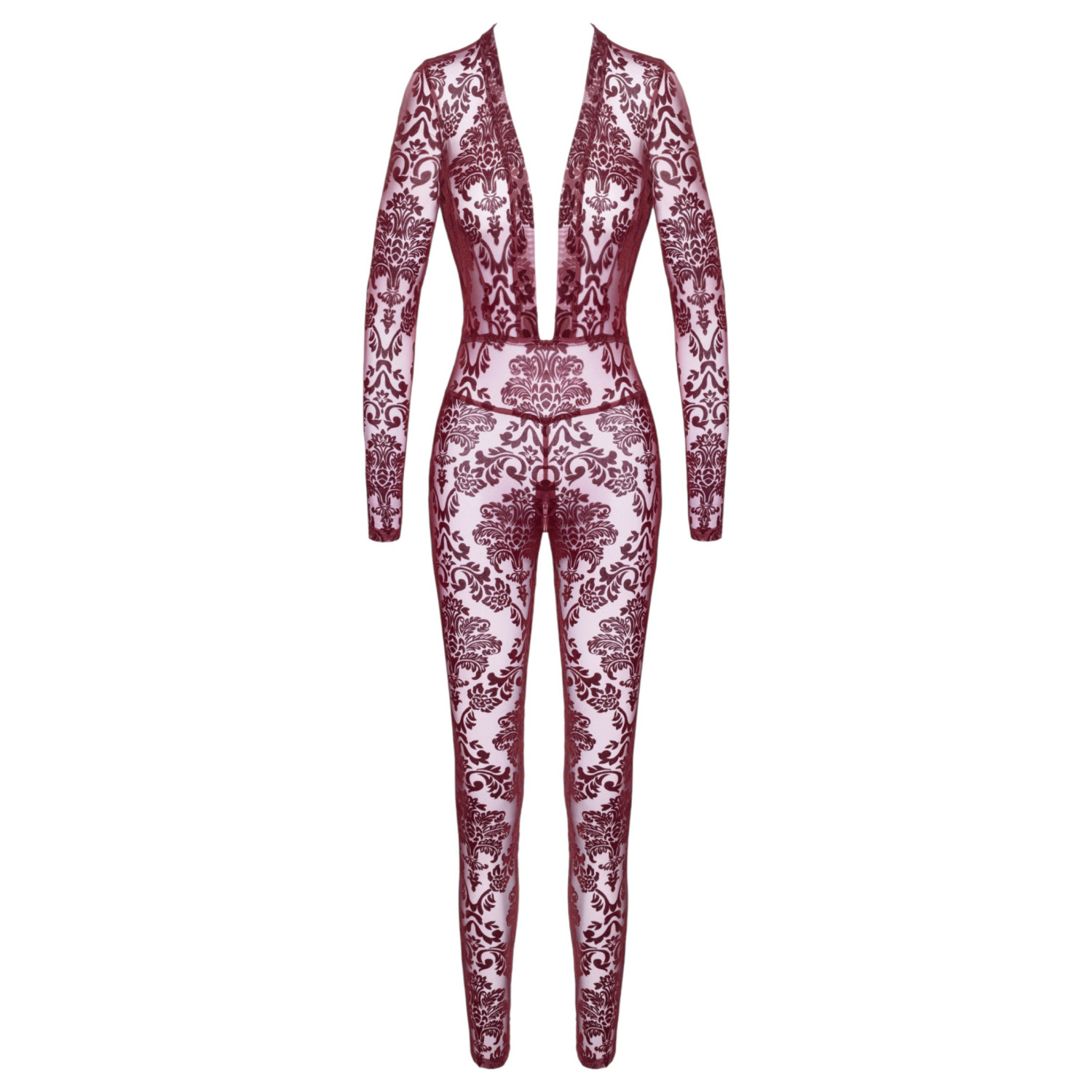 De Noir Kink Royal catsuit is ontworpen voor mensen die durven echt vrouwelijk en zelfverzekerd te zijn. De verleidelijk doorschijnende stof, de diep uitgesneden halslijn en de pasvorm die de lichaamsvormen accentueert, stralen zowel elegantie als erotische aantrekkingskracht uit - de perfecte keuze voor speciale avonden.