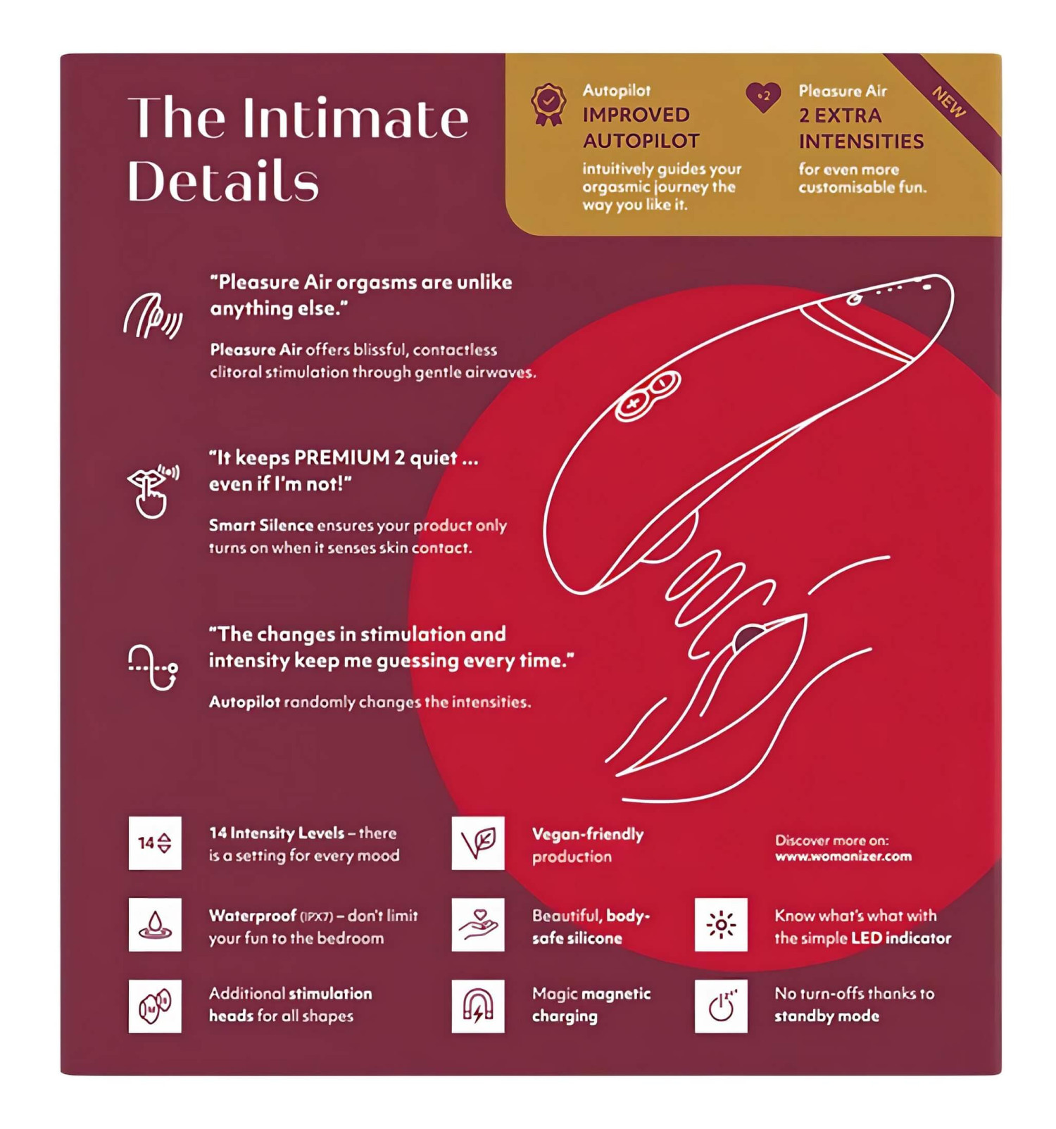 De Womanizer Premium 2 combineert de meest geavanceerde luchtdruktechnologie met Smart Silence functie en de Autopilot modus, waardoor elke ervaring uniek en onvergetelijk is.